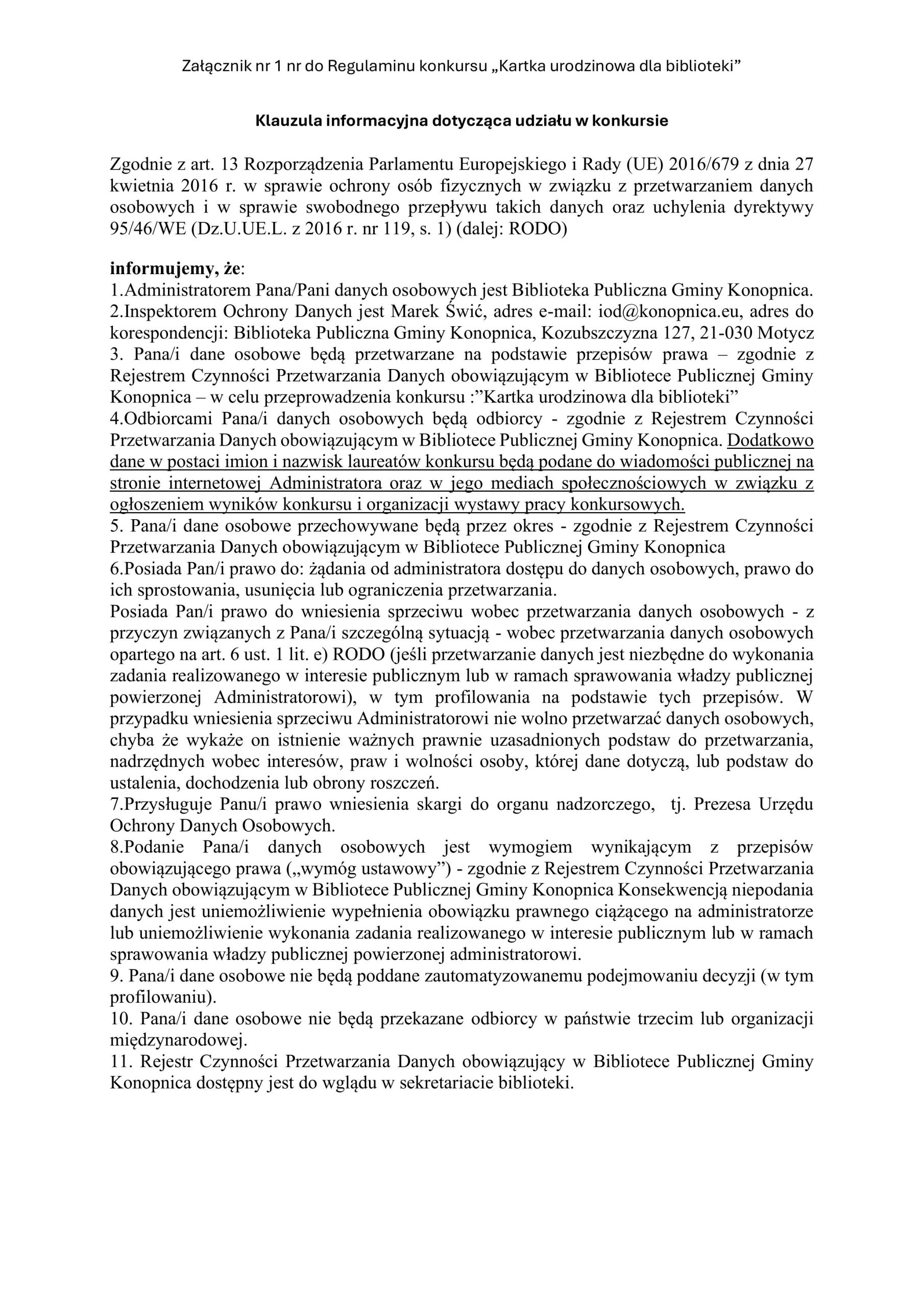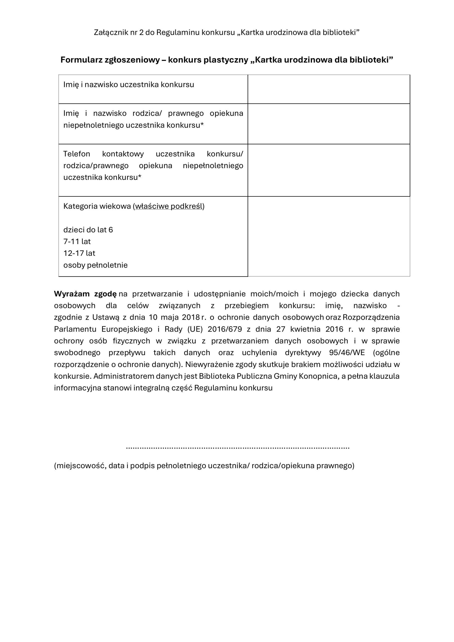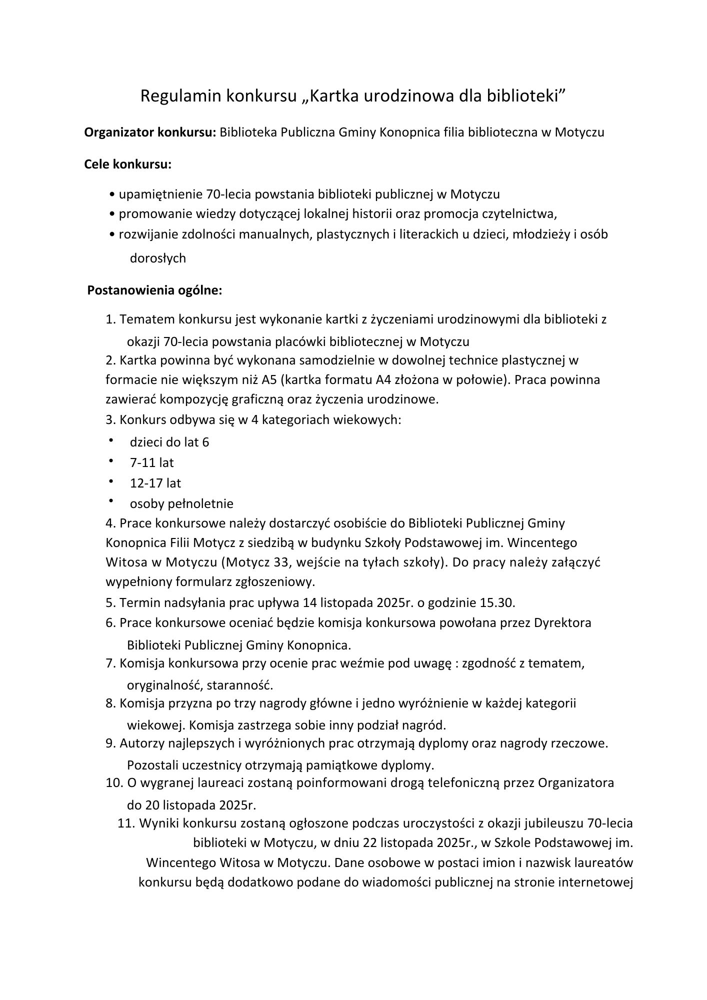 Zapraszamy wszystkich chętnych do udziału w konkursie „Kartka urodzinowa dla biblioteki”. Konkurs organizowany jest przez filię biblioteczną w Motyczu, z okazji jubileuszu 70-lecia tej placówki bibliotecznej.