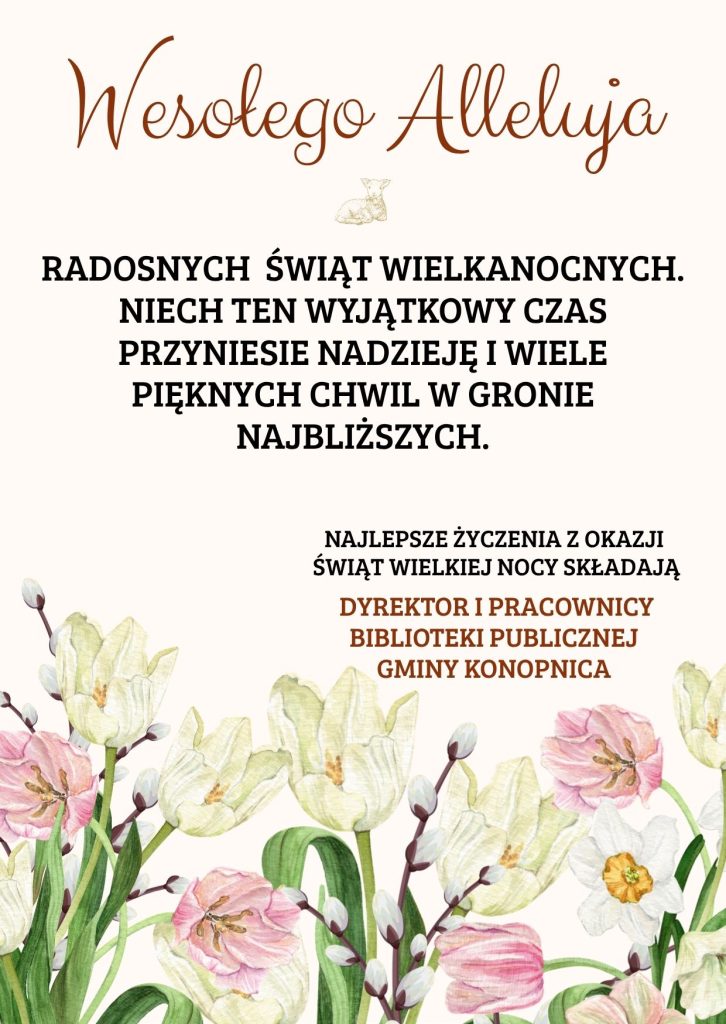 Najlepsze życzenia z okazji Świąt Wielkiej nocy składają Dyrektor i pracownicy Biblioteki Publicznej Gminy Konopnica.